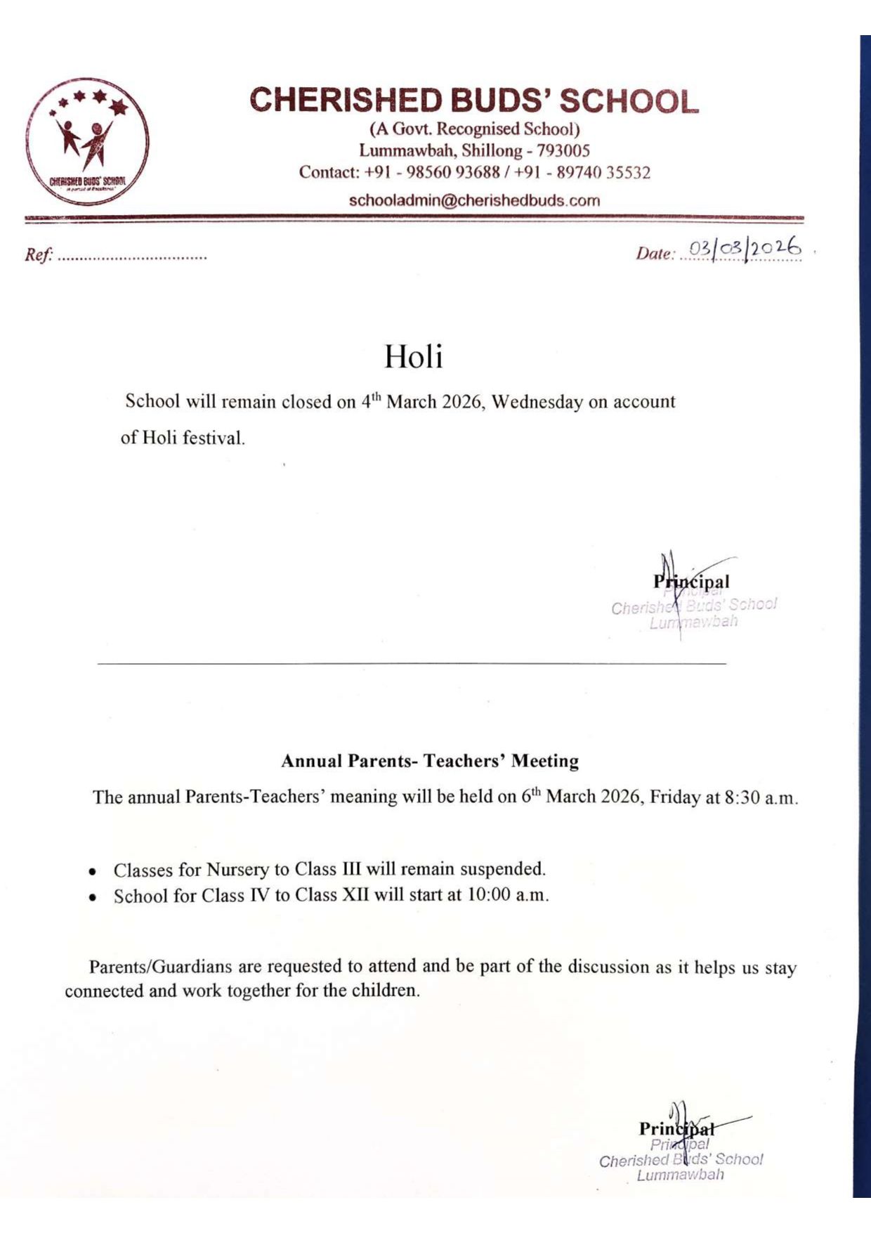 Our school has many upcoming events and programs. The Cherished Buds School is one of the premier schools of the area, and continues to be a favorite for parents in the area. The notice board keeps everyone updated with the latest announcements, achievements, and important schedules. It serves as a platform to showcase students’ talents, creative work, and upcoming competitions. Parents and students can easily stay informed and engaged with all school activities through regular updates. All academic activities will resume as per the regular schedule. Students are expected to attend in full uniform and be prepared for classes from the very first day. We encourage parents to ensure their children are punctual and well-prepared. The cooperation of both students and parents is essential in maintaining the academic discipline and smooth functioning of the school. For further details or assistance, please contact the school administration.
